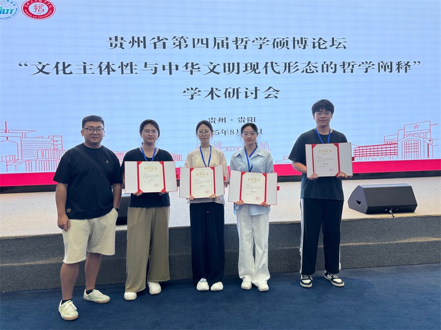 近日,由贵州省哲学学会、贵州大学研究生院、贵州大学人文社科处联合主办,贵州大学哲学学院、中国共产党人“心学”与推进党的建设新的伟大工程高端智库、贵州大学出版社联合承办的“贵州省第四届哲学硕博论坛——‘文化主体性与中华文明现代形态的哲学阐释’学术研讨会”在贵州大学召开。我校哲学学院4名学生参加此次论坛,并荣获二等奖1项、优秀论文3篇,充分展现了学子学术潜力和学校在人才培养上的育人成果。