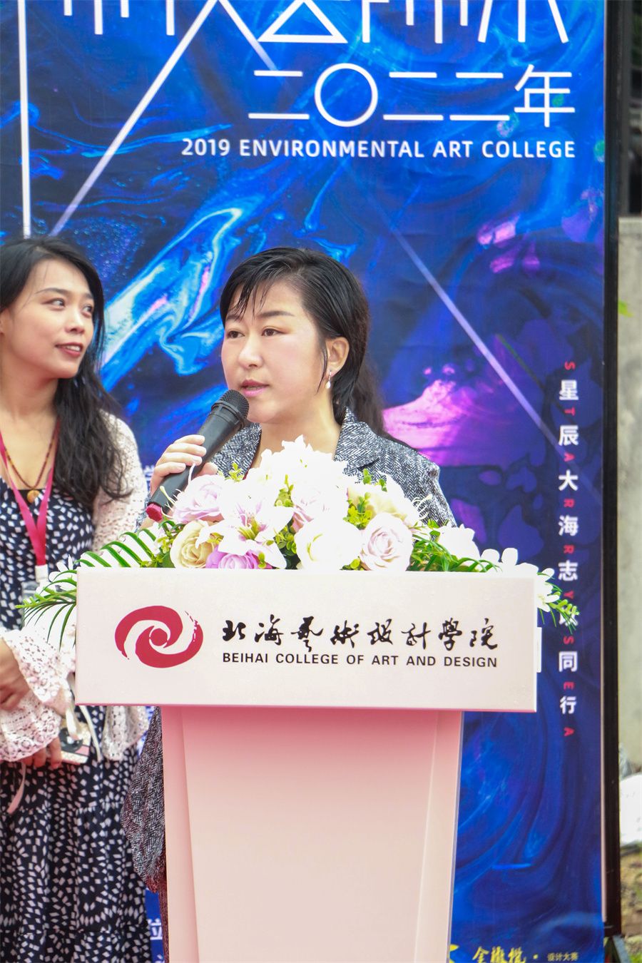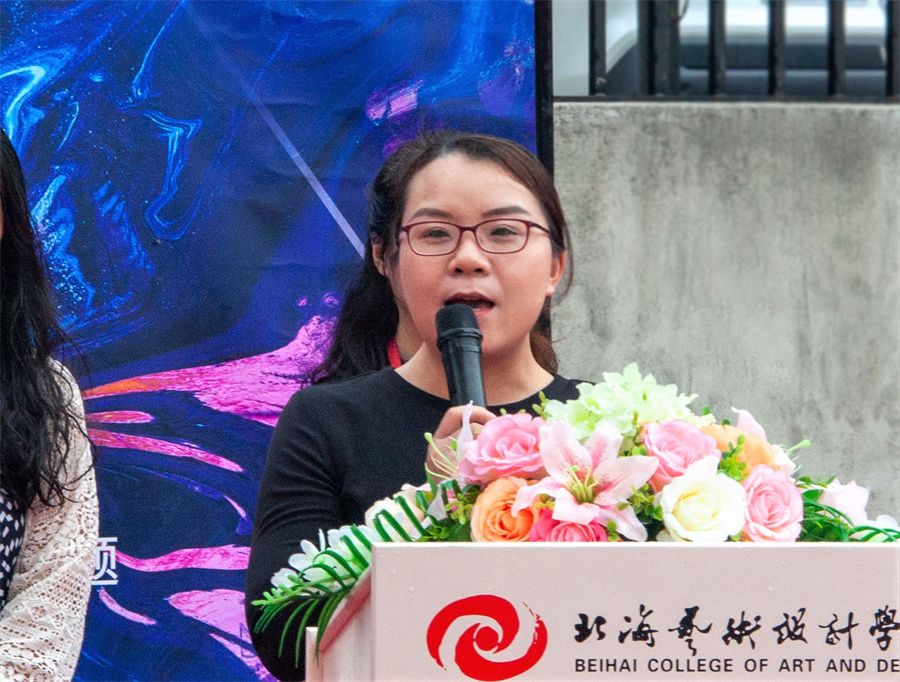 校党委副书记韦静月宣布建筑与环境艺术学院2019级环境设计专业金橄榄杯《陈设设计》课程思政作品展正式开幕。